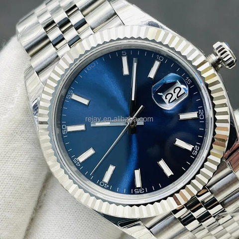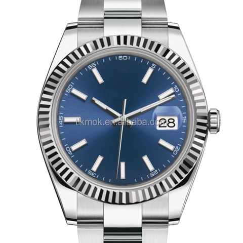 Relojes de lujo de acero inoxidable con correa azul claro para hombre, fecha automática Eta 2824, bisel estriado, movimiento automático mecánico, reloj para hombre